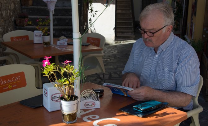 We were persuaded by our host after coffee and croissants, to try some homemade Arancini – very tasty deep fried balls of savoury rice with different flavours; fuel for a hard day’s sightseeing and likely to add an inch or three to the waistline.Chris below, staying calm as he examines the military campaign that is ‘Another Day in Sicily.’