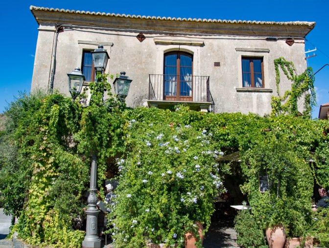 We parked easily at the edge of the village and walked up to Bar Vitelli, completely recognisable from the film, a square traditional building, very lovely and with its small courtyard now heavily shaded by vines. It really was the kind of café you dream of finding in Sicily. Amazingly, we were able to sit at the very table used in the film so there we were, ordering lattes and pistachio cake and sitting where a very young Al Pacino created one of cinema’s most fascinating and ruthless characters, Michael Corleone. And then I realised that playing softly in the background was The Godfather’s gorgeous main theme – ‘Speak Softly Love.’ I have to admit, it was quite overwhelming for a film buff like me and the tears began. I think this was the moment I began to really fall for this part of Sicily: sun-drenched and craggy, Etna sweeping elegantly and impressively 11,000 feet above the sparkling sea, bougainvillea spilling voluptuously from walls and gardens. And of course, we were about to discover how beautiful and classy the area’s most famous town, Taormina, was.