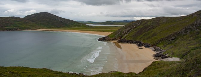Quite an area altogether but now it was off towards Tra Na Rossan beach and what turned out to be – along with Sheskinmore Nature Reserve – one of the loveliest unspoilt areas I’ve yet seen in Ireland. Firstly, through the very busy resort of Downings (huge caravan parks) which I was glad to leave behind. Then a great scenic drive round the quiet coast and a wow moment as the beach itself came into view.