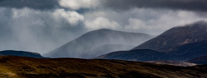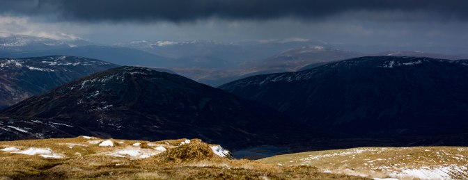 I loved that walk – the main ascent was over in no time and we were up on the high ground though a bitingly cold wind greeted us and snow flurries were already beginning. The weather was taking a turn for the worse! On we headed with another final, gradual climb (but always tough into a Baltic wind) and the distant Cairngorms emerged, cloaked in ominous looking cloud.
