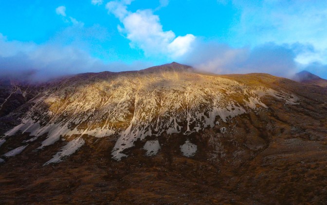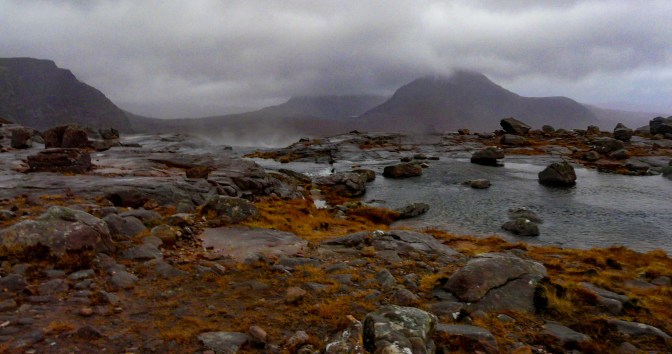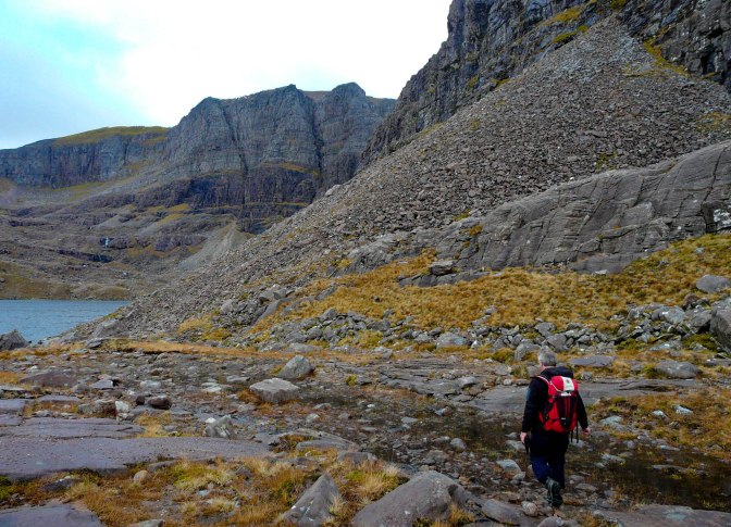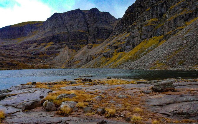 To the left, was the pink – orange scree gully which gives access to the higher slopes. I had made my way up that eroded gully many years ago, on a summer round of the two Munros of Beinn Eighe. Lovely ridge walking with no difficulties up there and stunning views.It reminds me a little of Lake Oesa in the Lake O’Hara region of the Canadian Rockies.