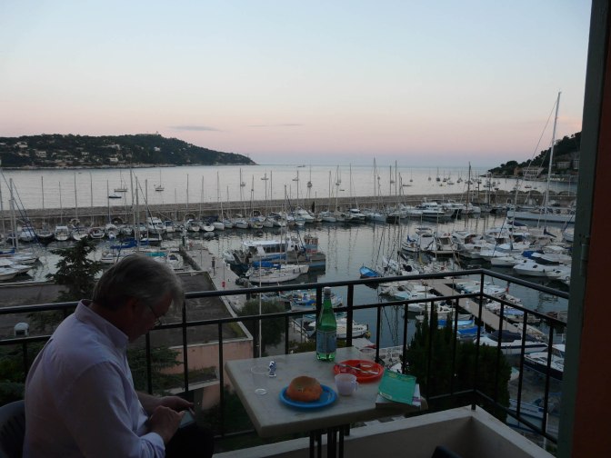 We don’t always like going out to eat so the evening was spent relaxing on the balcony , with wine, the Foie Gras and a Fig compote, good Parma ham, tomatoes and Emmental cheese. We watched the sun going down and the big cruise ship which was anchored off shore, slipping out of the bay, off to its next port of call.Tomorrow, ours would be Monaco and a Michelin lunch at Chateau Eza.