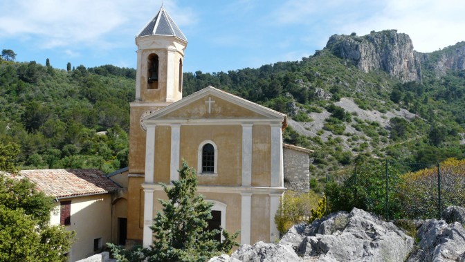 We were in high country now and not a soul stirred as we walked up Peillon’s silent little wynds. All end at the simple yellow church at the top of the hamlet, with its blue tower against a mountainous, wooded backdrop. The church bells tolled the hour (so evocative to me of mainland Europe) as we opened our packed lunch of sandwiches and sparkling water on the terrace. It felt quite magical to be in such an ancient, unchanged place of utter peace.