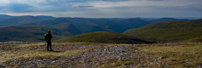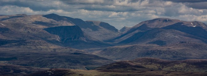 At 1045m or 3,400 feet, this was the higher of today’s two hills but very easily won from our high starting point – barely an hour’s walk. Nothing hellish about it either – in fact it felt like heaven up here. It was a beautiful day and we sat at the cairn for half an hour or so, having some fruit and just admiring the layer upon layer of hills and glens before us. The Cairngorms are big rounded plateaux mostly, unlike the sharper more shapely Western Highlands, but they have a majesty of their own too.