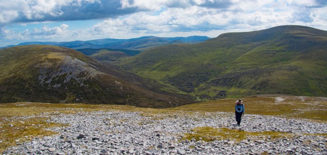 The Rocky Top of the King now beckoned so off we set, using a good path on nice dry ground, contouring Mam nan Carn and making for another track that took us down to a low col. From there, a well worn path made its way up to our second and final summit. It looked more of a slog than it actually was and we were soon at the top. It had taken us 90 mins in total from Iutharn Mhor – it was now just before 11am, three hours since we set out.We had a better view of the most outlying of Beinn a Ghlo’s four summits, a big day out, that one. We’d had the joy of finding a tiny Leveret at the summit of that mountain, many years back, cowering into the heather and watching us with its huge brown eyes. What a lovely wee thing it was.