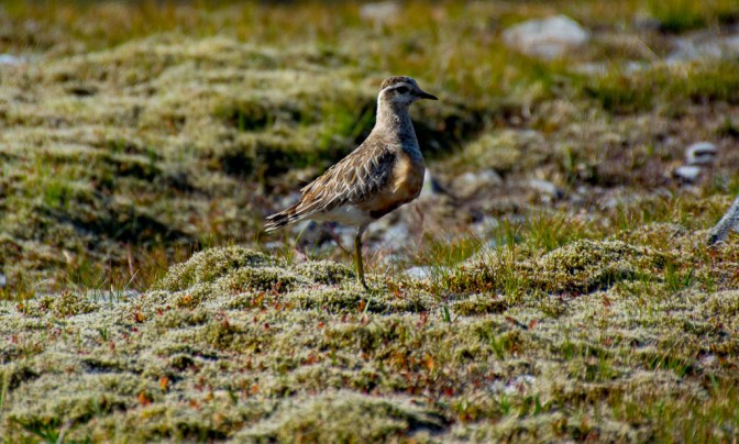 Then a mild ascent up to the summit, barely 200m above our camp but giving us wider views now of the mountains all around.The real thrill however, was seeing a Dotterel, a small quiet bird of remote high moorland, standing quite still as we approached. This was our first sighting ever of this uncommon bird – what a special start to the day, we were so chuffed!