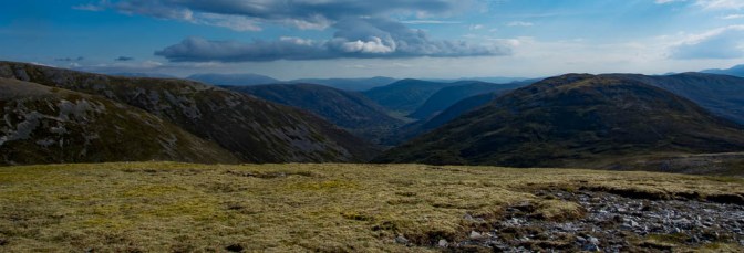 The plan was to reach Beinn Iutharn Mhor , translating from the Gaelic as the Big Mountain of Hell and Carn an Righ, the Rocky Top of the King. Our camp would be on the peaceful shores of Loch nan Eun, the Loch of the Bird, sitting at around 800m or 2,600 feet up. I love understanding the names of our mountains though I was hoping that the first mountain would be a more pleasant affair than its name suggested!