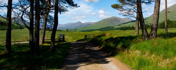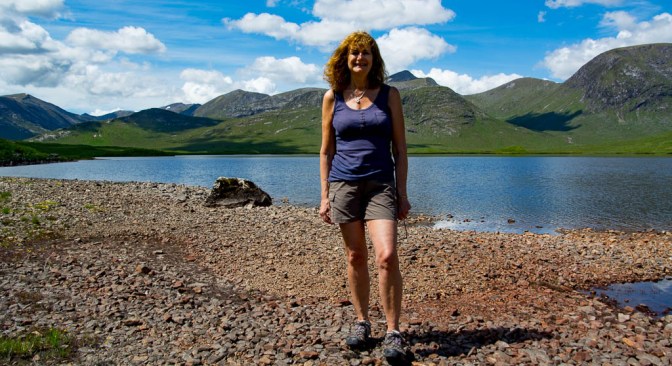 Off we set and as the great scenery began to unfold at Loch Lomond, my spirits lifted – the mountains were looking good, every shade of green, their rocky outcrops a dusky pink.By the time we reached the Black Mount and pulled into the tiny single track road to Inveroran, the day had turned quite brilliant – puffy white clouds, barely a breath of wind and wow…the heat! As we stepped out of the car, it was stifling. Unusual conditions for the Highlands even in mid-summer.There were 10 other cars in the small , rough parking area – almost full – so the good weather had drawn a lot of wilderness loving folks out.