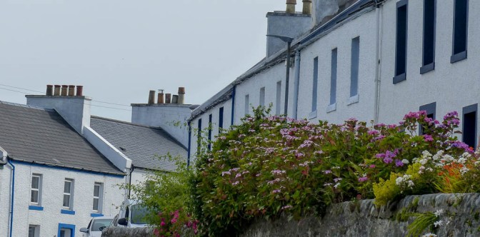 Port Charlotte is Islay’s prettiest village, with beautifully kept traditional white-washed houses, flower filled gardens and the waters of the huge sea loch, Loch Indaal, lapping gently on its rocky shores.Dolphins come in quite close at times.If anything the village looked even neater than I remembered it; there must be a lot of second home holiday owners.
