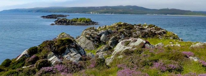 Not much time next day to do more than pack up the gear, get ourselves away and re-pack the car a bit; it does become a bit of a bomb-site. Then a drive into Bowmore for some cakes at The Celtic House. A short walk through Port Ellen and out to a small rocky promontory, covered in Bell Heather and a final look across to the Oa peninsula.It all looked so lovely in the sunshine and oh so difficult to leave!