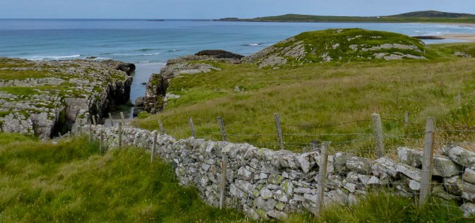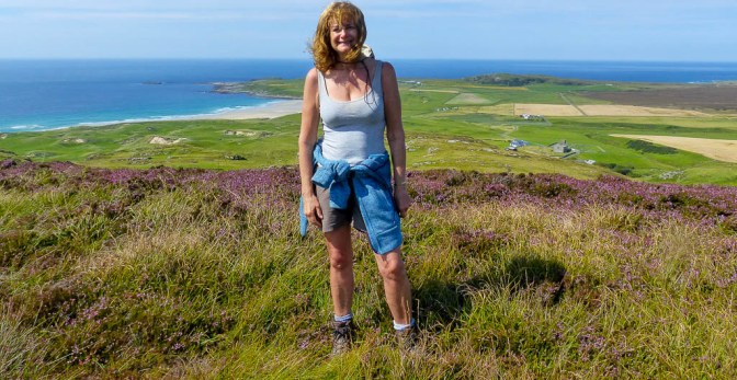 In 40 mins or so of ambling along, we were heading up the final grassy slopes, past a herd of Highland cattle, arriving on the surprisingly large hill top area, with its rather ugly cluster of Radio Transmitters and old war – time lookouts.But it’s still well worth getting up there for the sweeping views over the sea, the sands and the emerald grasslands. I’d made up cold meat and coleslaw sandwiches whose time had now come, demolishing them as we sat on some flat rocks enjoying the vista.It was magical to be up here again after a 10 year gap.