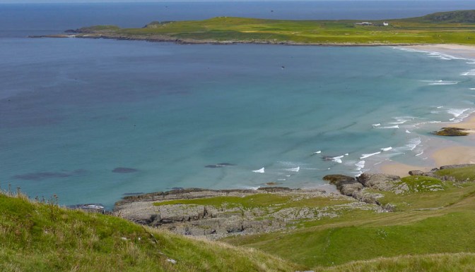 From Kilchoman beach car park, we headed down through the dunes, to the lovely 2km sands themselves. They are usually pounded by heavy surf , a great walk on a breezy day, but the ocean was incredibly calm today.We made left for the beach’s southern end where a small summits wettish but obvious track winds its way easily below and round the back of the crags and up onto the top of the small hill with the radio transmitters. As we climbed, the views improved all the time, revealing a rugged coastline, lapped today by a benign, turquoise Atlantic Ocean.It all looked so beautiful.