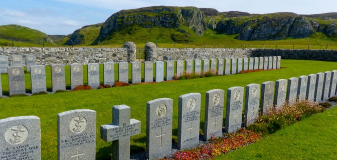 What a beautiful place – on short cropped grass, on a small hillock overlooking the Atlantic Ocean, immaculately kept, the base of each headstone planted with local flowers. A silent, beautiful final resting place for some of the men of the ‘Otranto’ troopship which went down off Kilchoman in 1918.We were both deeply moved by it.