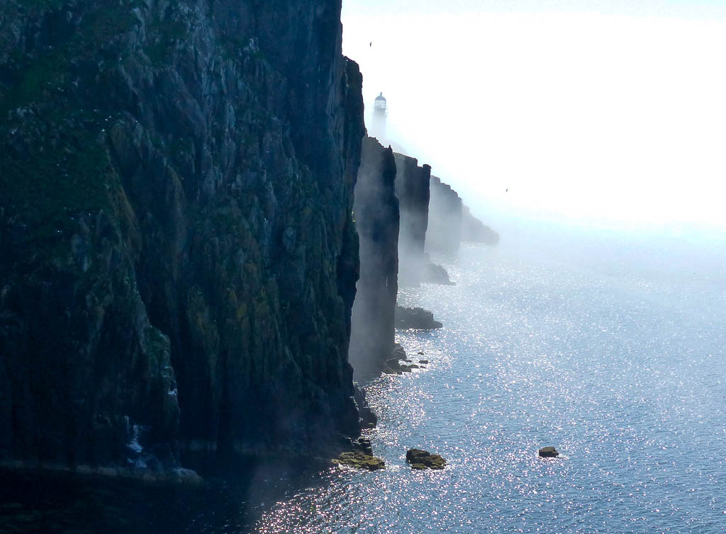 Then back up to find the main track again, past the sheep with their earthy smell. I’d thought the spectacle was as good as it got by that point but something made us wander out to the very edge of the cliffs, below the Lighthouse.What an incredible view we then had of the layers of vertical rock, swathed in fog at times despite the sunny blue skies.It was unreal, slightly unearthly and now a spot I would always make for when visting Neist. How strange I’d never seen it before or realised the view. Or perhaps it was those particular conditions which added to the wonder of it all.