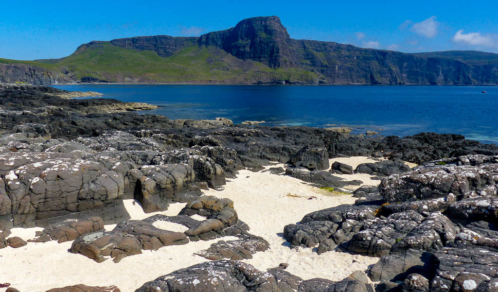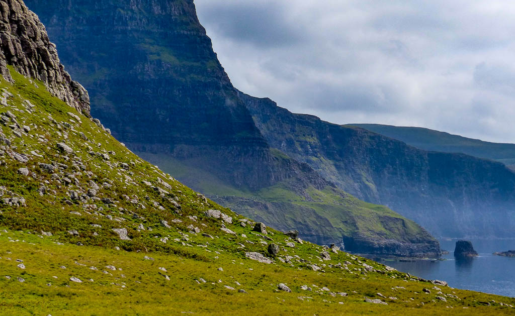 This is a tremendous area of 300m cliffs, wild ocean and a good concrete track which took us out to the Lighthouse in 25 mins or so – a great spot for watching for whales and dolphins. But really, the scenery is the thing. Unless it’s the dead of winter, you will not have Neist to yourself but it’s one of those places that seems to rise above the stream of people enjoying the vistas. Plus there are plenty corners to relax in all to oneself.’Neist’ as a word translates possibly from the Gaelic for ‘gelded horse’ – though why gelded (or castrated) I don’t know! From certain angles/distance the Point does resemble a horse’s head.