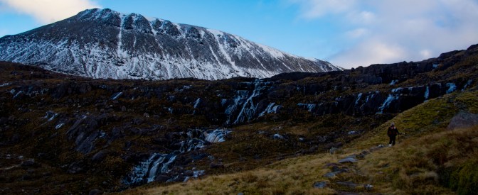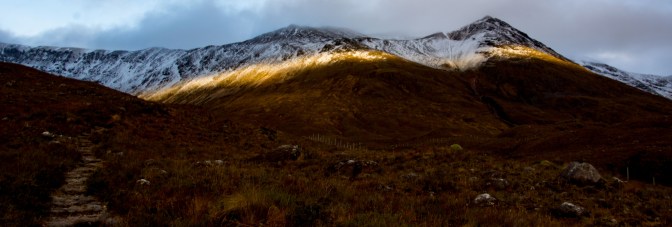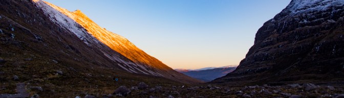 It was pitch dark in the glen by the time we arrived at the car park at 4.20pm, weary but thrilled that we’d visited, once again, this hidden glory of the Highlands, as wild a corner as anyone could wish for.Suddenly, it felt quite lucky that we’d set off a good hour or more later than we’d meant to and were treated to some beautiful light on the mountains which we wouldn’t have seen with an earlier start.Funny how it often all works out for the best in the end…