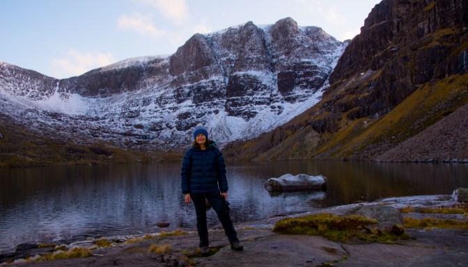 And suddenly, there we were – in the heart of Beinn Eighe, the loch now in front of us – carefully traversing the big flat rock slabs of this impressive corrie. The Triple Buttresses of the mountain fall sheer into the cold waters an today, the shores were partly ringed with ice.