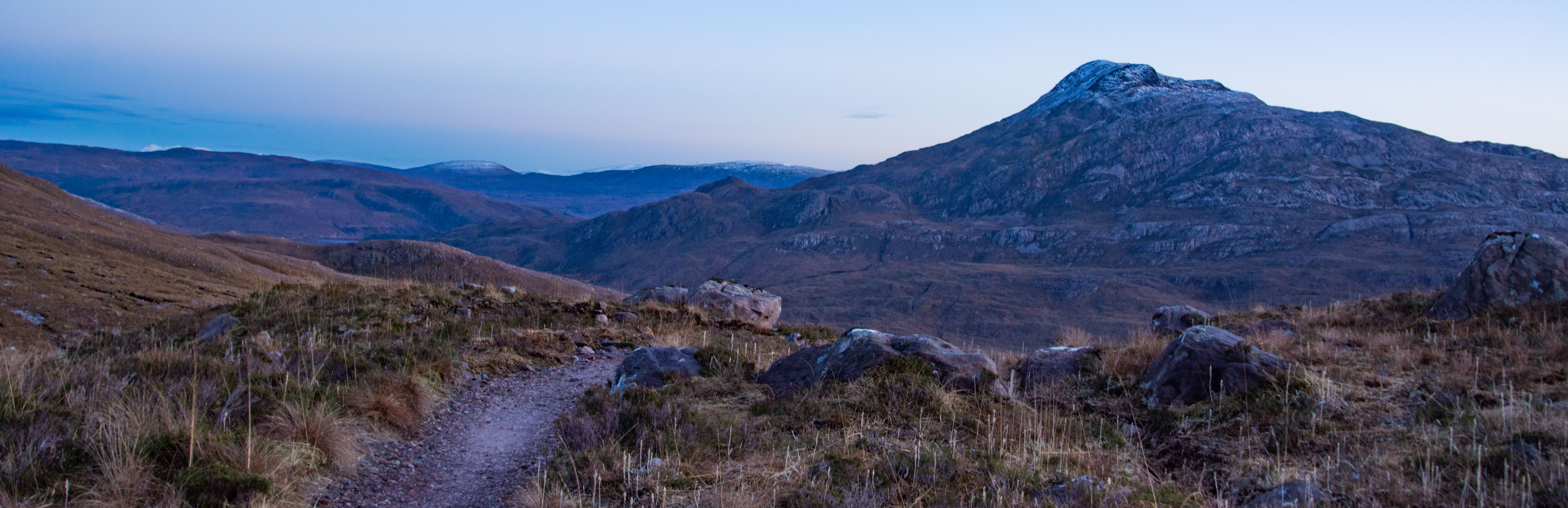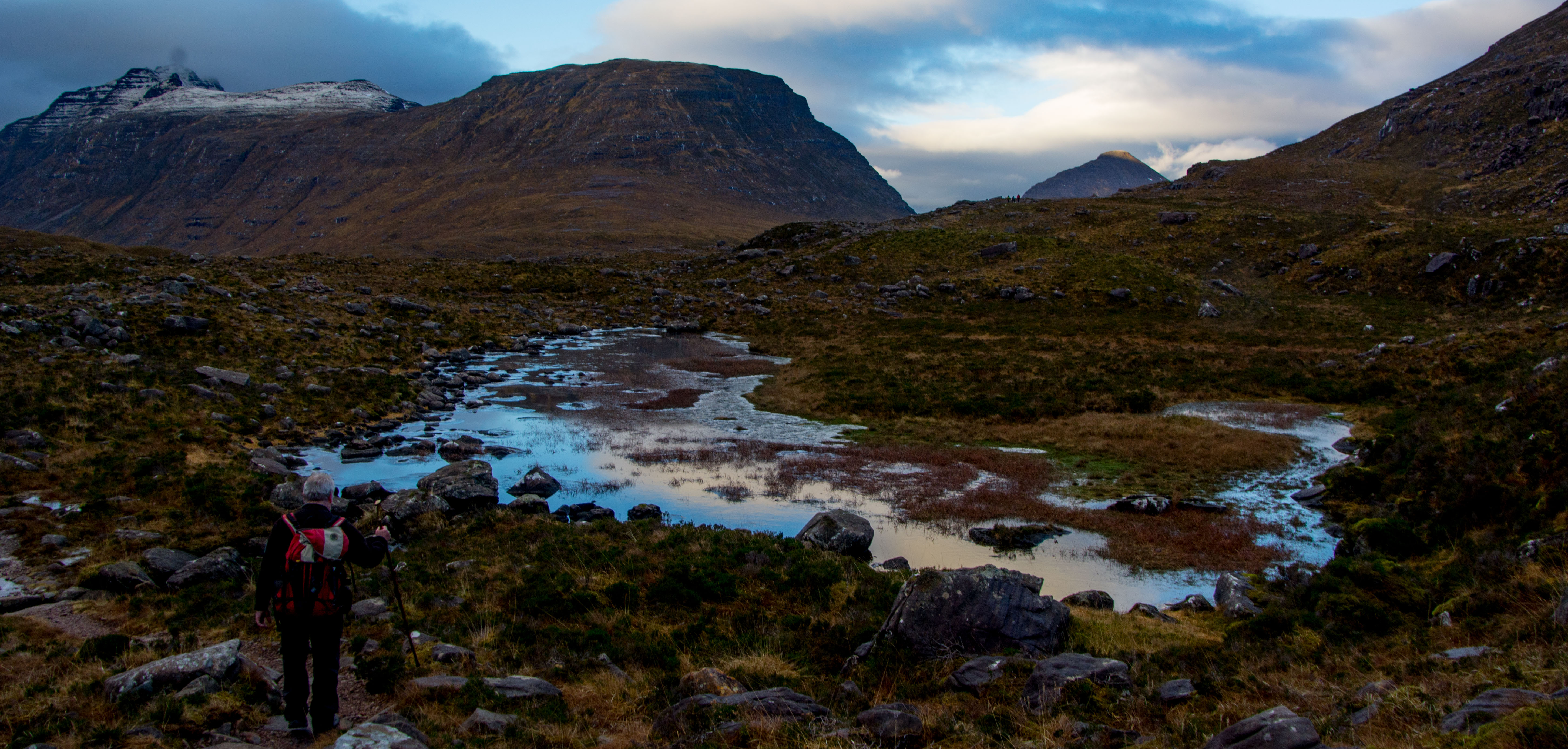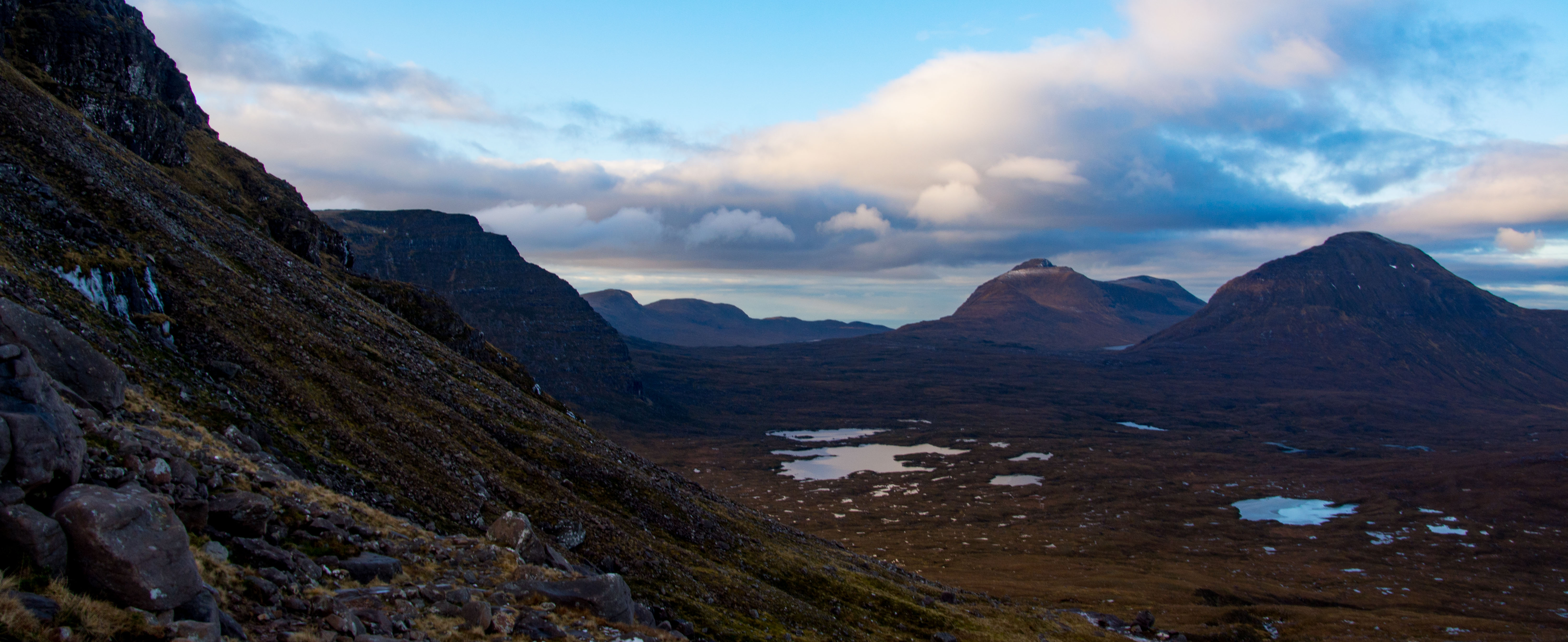 The quartzite slopes of Beinn Eighe were catching some sun but still looked austere and thigh-burningly steep as we began the initial climb up the path.