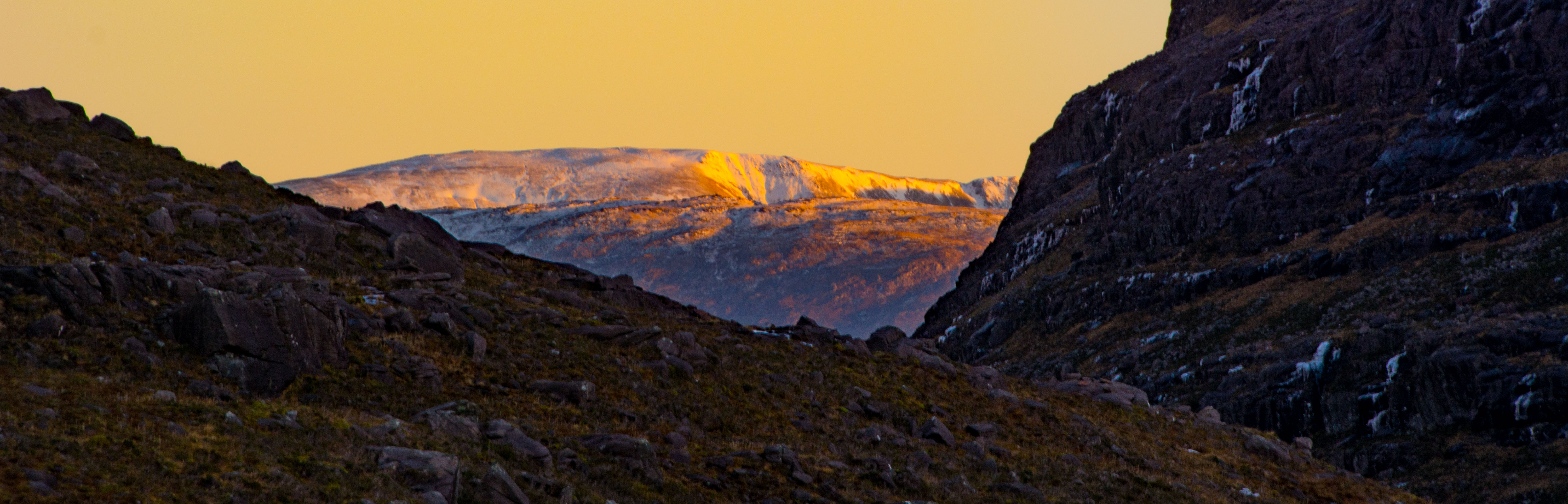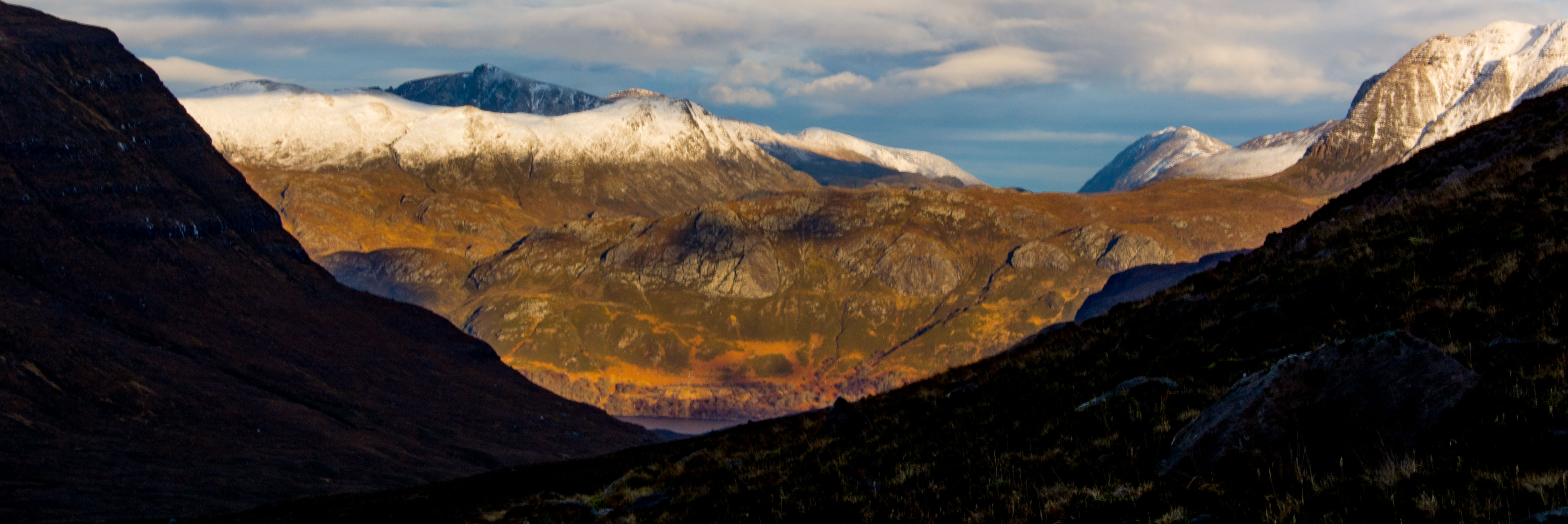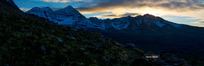 We still had an hour to go but my impatience to reach the loch was quickly put aside as we turned a corner and ahead lay the great mountain ranges above Loch Maree. The sun, so low in the sky, had found a breach in the clouds and now cast Slioch and the other hills in a spectacular orange light. It was absolutely stunning and another highlight of the walk in.