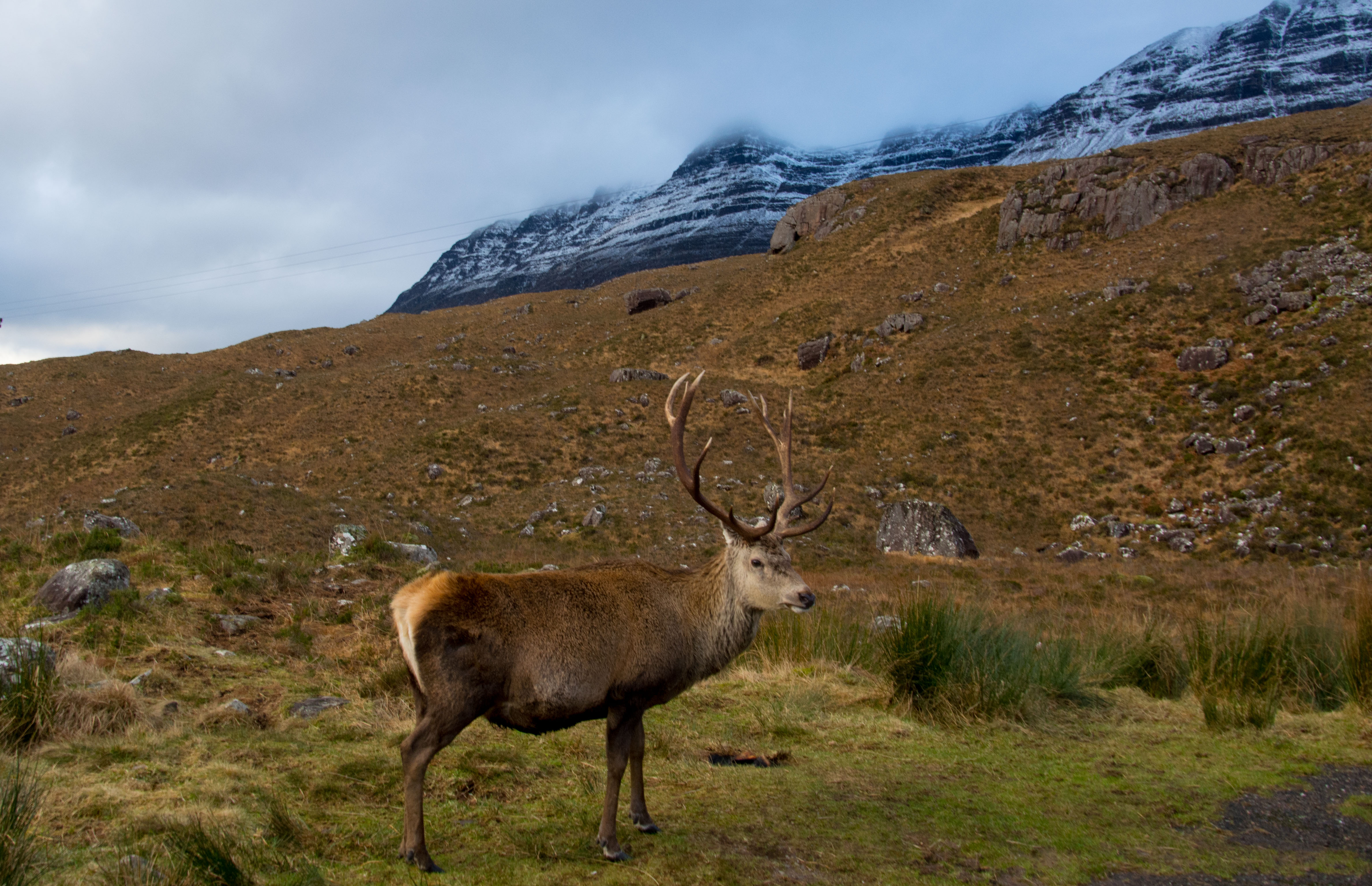 The car park in Glen Torridon (the only one!) is well signposted and opposite the little white building known as the Ling Hut.It was busy when we arrived at 11am – rather later than planned, as we’d slept in! So already, I was a bit stressed (my default frame of mind) as days are short and it’s dark by 4.15pm.We were cutting it a bit fine if we wanted to enjoy a picnic at the loch itself! Chris assured me we were ok – just – so off we set at a fair rate of knots. But not before I got some photos of the handsome Red Deer stag which now grazes at the car park, hoping to be fed by visitors.