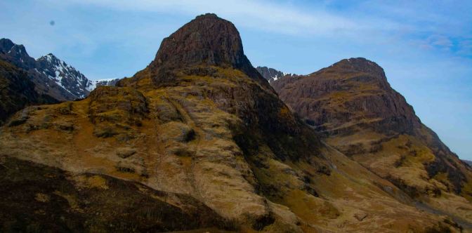 There is a great view from here of the Three Sisters, the craggy mountains which dominate the glen.Behind them , lies Argyll’s highest peak, Bidean nam Bian at 1150m/3772 feet.