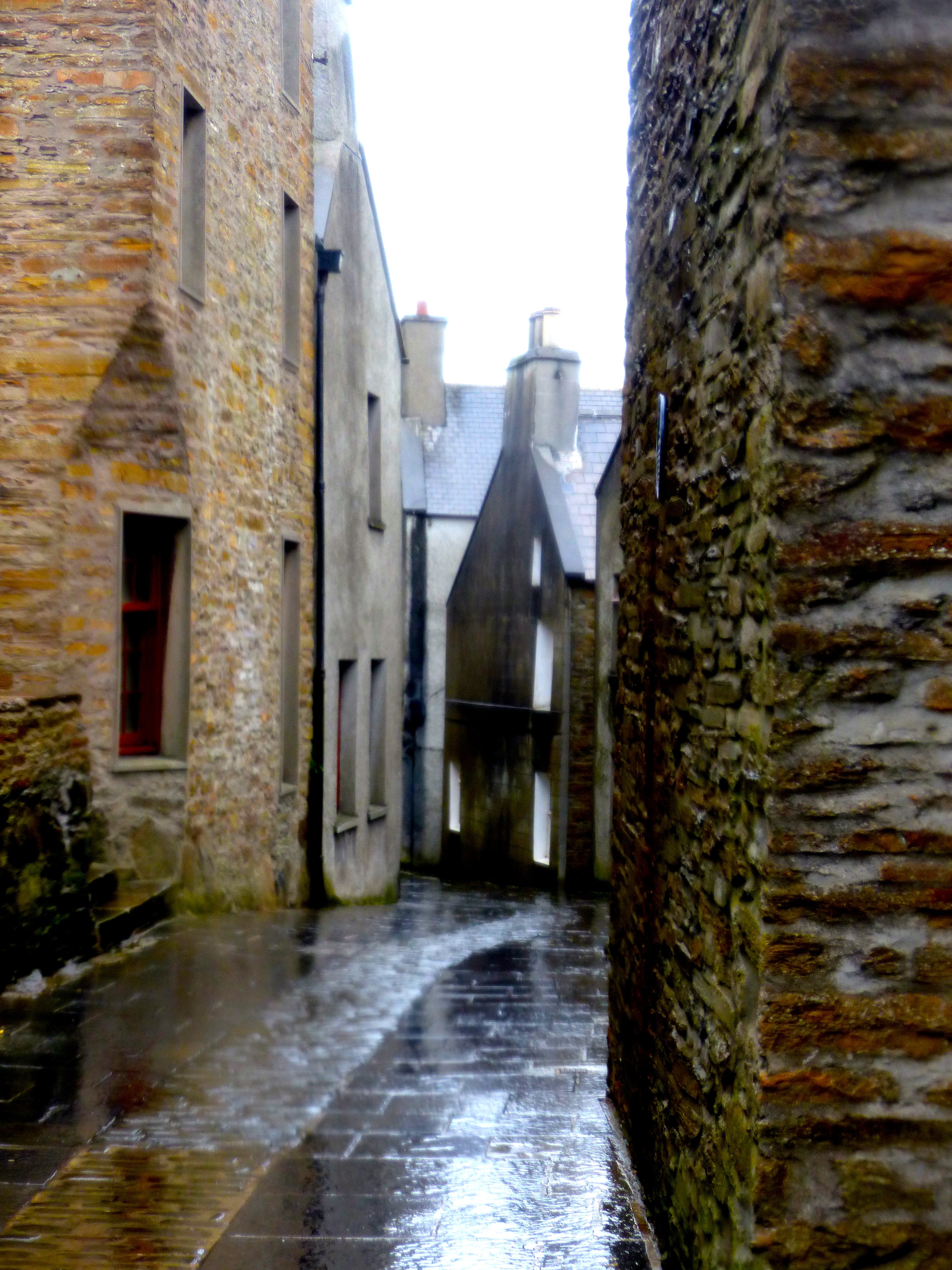 Hoy looked very grey across the Sound, it’s high hills cut off mid-way by the clag. Good decision to have abandoned the walk.I parked up at the town’s entrance and made my way down to a little cafe I’d read about – Julia’s – for a much needed latte and scone.It was going like a fair but I got a table at a window from which I had a view of the huge ferries to Shetland and the Scottish mainland which had docked. The harbour area isn’t a pretty one – very commercial, almost industrial but I knew the delights of the grey/brown town lay in its back streets.