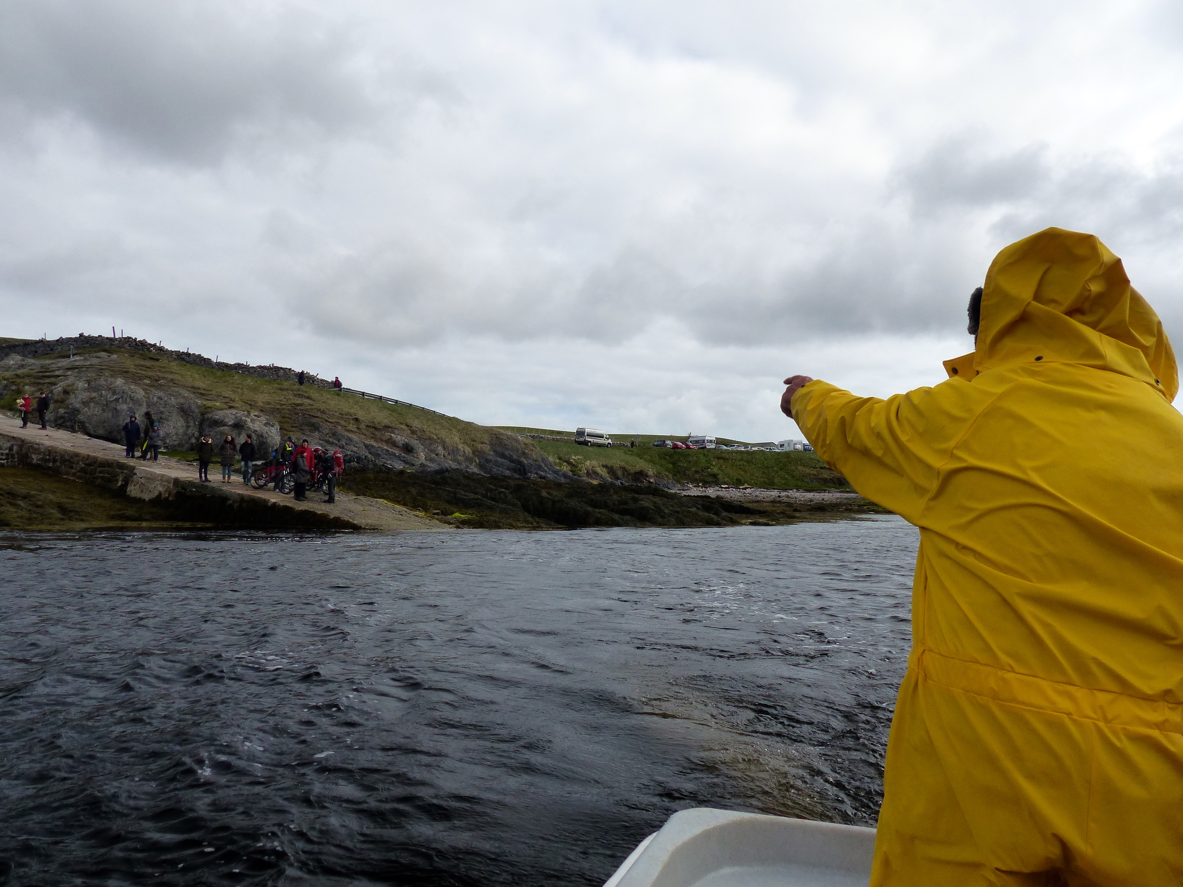 A bit bemused at the scene, I chatted to a couple who explained the crowds; the wind had cancelled yesterday’s trip and everyone had been told to turn up at 11am for the first crossing today. But the tiny motor boat ( seating 5 max ) was already plowing its way back across the choppy inlet having dropped the first group of would-be visitors off at the other side. There were already far more than 16 folk on the jetty so we weren’t all going to make it. Mumblings and grumblings began behind us. One couple bemoaned the fact that they had travelled from Germany no less, to see this famous spot. German efficiency was clearly no match for the ferryman deciding to get up a bit earlier that morning and start taking whoever was there two hours earlier. We had wandered into a maelstrom of tension and frustration in the peaceful and beautiful surroundings of the Kyle of Durness! A very bizarre start to the day.