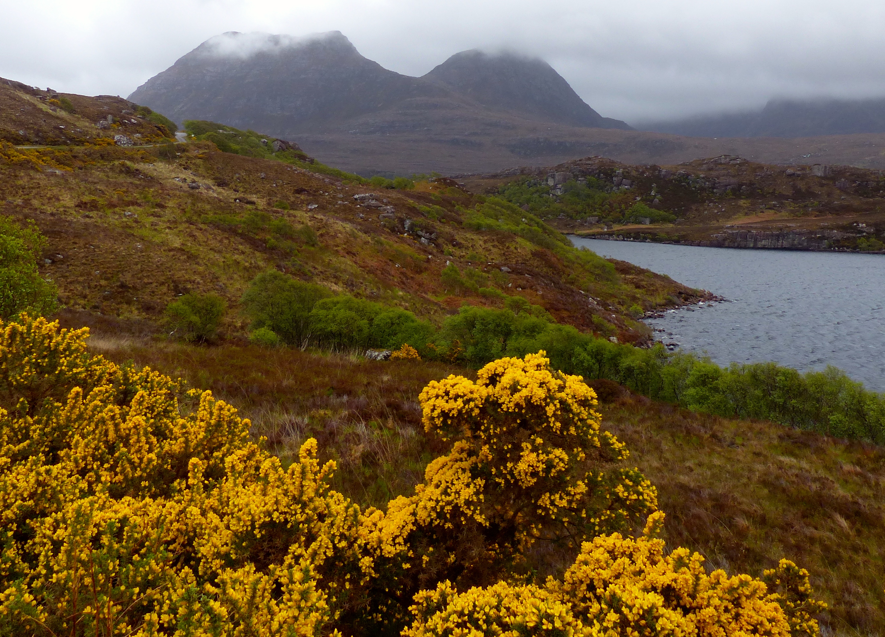 Then the little white houses of Ullapool appeared on the far horizon as we headed along Loch Broom, everything bathed in that cold , Far North light.The gorse was out everywhere, splashing the landscape with dazzling yellow.The hills still look a bit brown/ dullish green in May with none of the vibrant bright greens of true summer. It would be July before these developed and August before the heather started to really bloom.